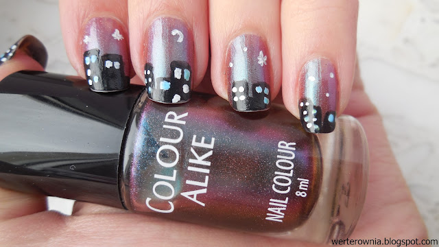 Potem przy pomocy cienkiego pędzelka i dwóch farbek wykonałam zdobienia. Na koniec niebieskim lakierem wypełniłam kilka "okien", a całość pokryłam bezbarwnym lakierem od Essence.